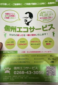 【信州エコサービスのチラシのご紹介】 信州エコサービスはみなさまの目に届いていただけるよう、チラシにも掲載をしております! チラシには割引の内容も掲載していますので、チラシを見た方は「チラシを見た!」とご連絡ください! みなさまのお悩みを少しでも解決できるようにこれからも発信していきます。 気になる方はお電話・LINE・メールなんでも大丈夫ですのでぜひ一度お気軽にご相談ください!